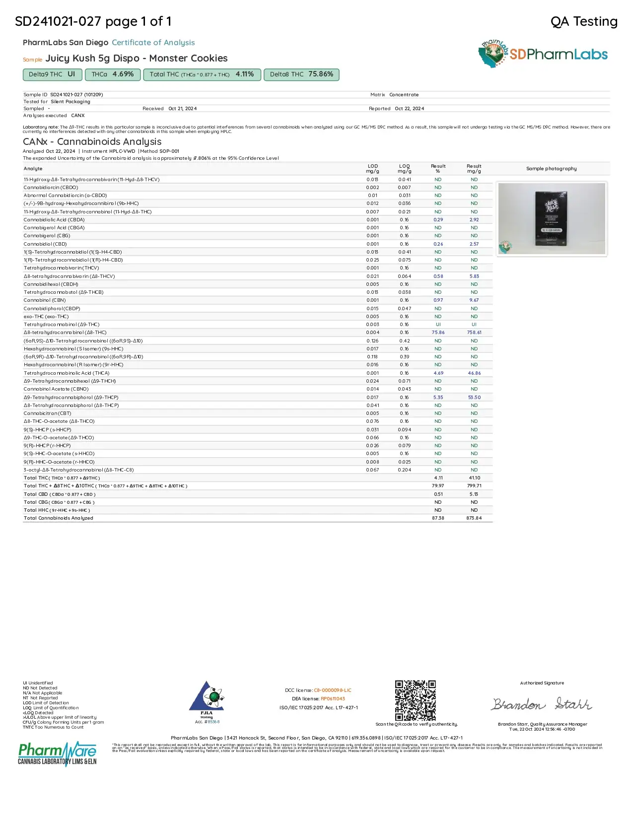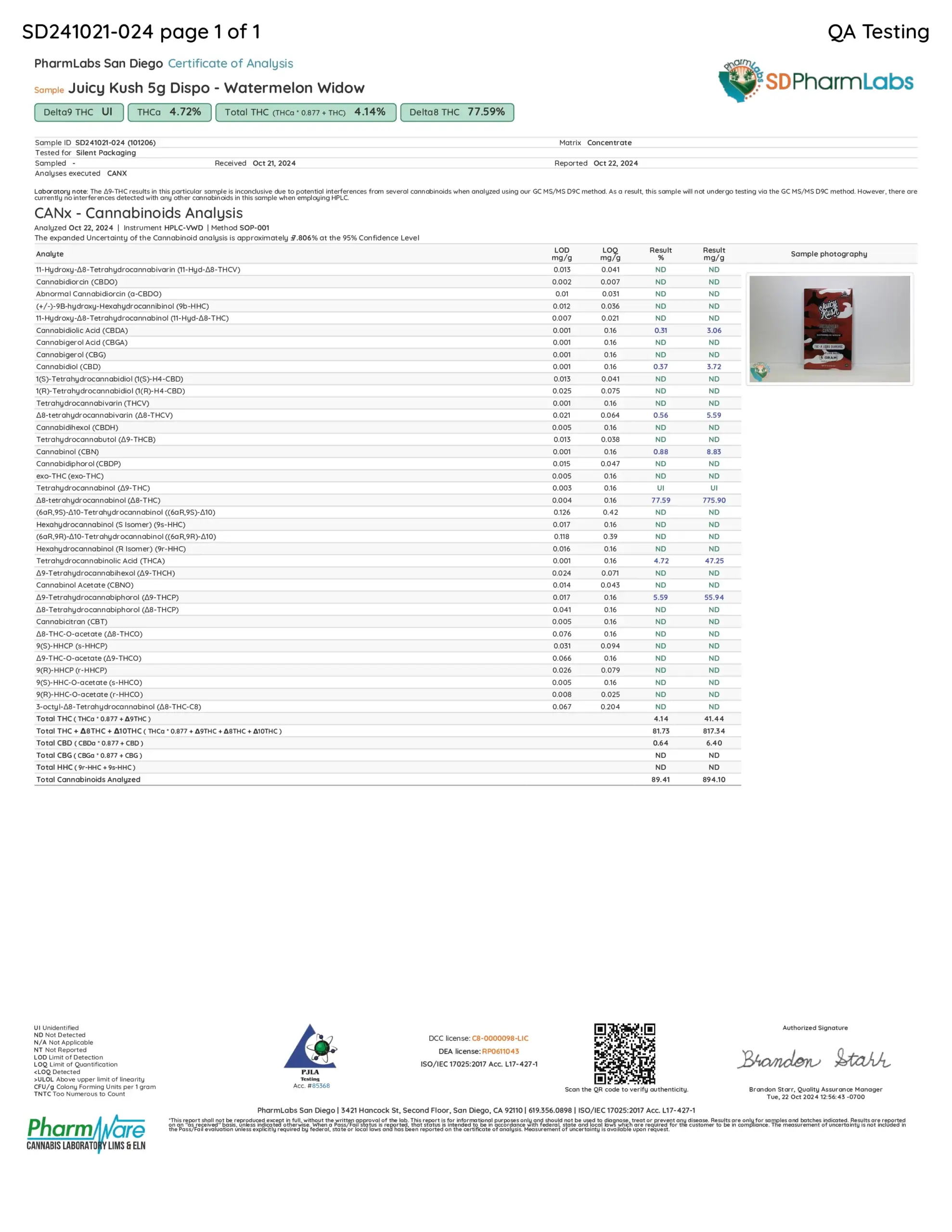 Infused with strain-specific terpenes and THCa liquid diamonds, each puff delivers smooth, flavorful vapor with powerful effects tailored to your preference. Thanks to advanced extraction methods, Juicy Kush retains the full essence of the original strains—no fillers, no additives, just clean, potent clouds.Juicy Kush Diamond Rosin Disposable 5g Watermelon Widow (Sativa) – Lab Report